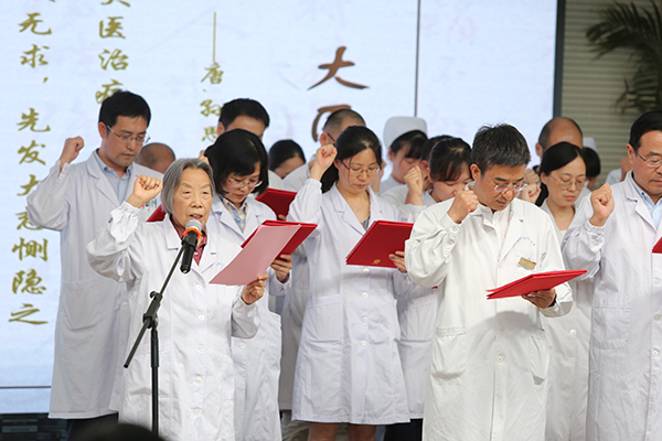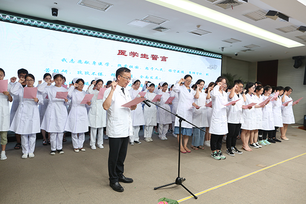 新入职医务人员在“省百名医德之星”刘超教授的带领下,庄严宣读《医学生誓言》,寥寥数语,却是对患者一生的承诺。