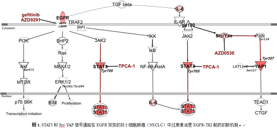 非小细胞肺癌是肺癌的主要类型,严重威胁人类健康。分子靶向药物EGFR-TKI在临床上广泛应用于靶向治疗EGFR突变的NSCLC,疗效显著。然而,初始靶向治疗有效的NSCLC患者可在一年内出现耐药,如何解决耐药问题成为临床医生和基础科研工作者共同关注的热点。本项研究通过分析119例EGFR突变NSCLC患者肿瘤组织的STAT3和YAP1 mRNA水平,发现STAT3和YAP1 mRNA水平与患者无进展生存期成负相关,于是提出假说:STAT3和Src-YAP信号通路的双重激活使NSCLC患者对EGFR-TKI产生获得性耐药,导致靶向治疗失败。细胞实验证实EGFR-TKI诱导激活STAT3信号通路的同时,通过Scr诱导激活YAP1-Notch信号通路。因此,合作团队认为同时靶向STAT3、Src和EGFR通路,可迅速抑制肿瘤细胞生长。体内外实验证实联合使用STAT3抑制剂(TPCA-1)、Src抑制剂(AZD0530)和EGFR-TKI确实可有效抑制非小细胞肺癌细胞和荷瘤小鼠肿瘤的生长。EGFR下游通路激活是EGFR-TKI产生耐药的重要机制,联合多靶点阻滞下游通路,是未来NSCLC靶向治疗的新策略。本项目得到国家自然科学基金(No.81573680)和江苏省杰出青年基金 (No. BK20140049)资助。