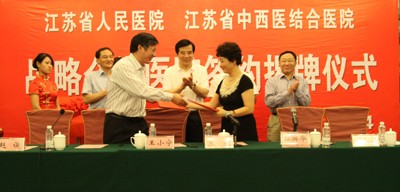 2010年9月24日下午,我院与江苏省人民医院战略合作签约仪式在新世纪酒店举行。签约仪式由江苏省中医药局医政科教处孙志广处长主持,江苏省卫生厅郭兴华厅长、江苏省人民医院王虹院长、徐长江副书记赵俊副院长、及我院领导班子全体成员出席了签约仪式。