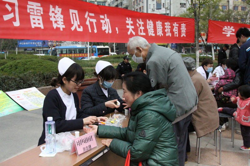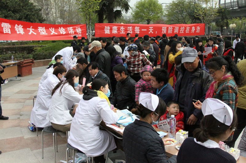 为传承和弘扬雷锋精神,在全省卫生青年中倡导志愿服务精神,3月30日,省卫生厅团委在迈皋桥广场举行大型义诊活动,为老百姓送健康。江苏省人民医院、省中医院、省疾控、省卫生监督所和我院等十三家在宁直属单位参加此次活动。 当天上午,近30名医护工作者现场为群众开展专病咨询,讲解健康生活方式,免费开展推拿和耳穴埋籽,测量血压、血糖、血型,宣传了健康理念的同时也为社区群众送去了方便和实惠,活动受到百姓欢迎,义诊达500人次,发放宣传资料近千册。 活动得到卫生厅机关党委和栖霞区卫生局高度重视,厅党组成员、纪检组组长周政兴,厅团委书记束一平,栖霞区卫生局局长吕俊,副局长汪厚忠亲临现场慰问医务青年志愿者,我院副院长王佩娟陪同。 此次活动由我院团委具体承办,广大团员青年积极踊跃,耐心解答群众咨询,认真热情为他们检测血糖,受到一致好评。